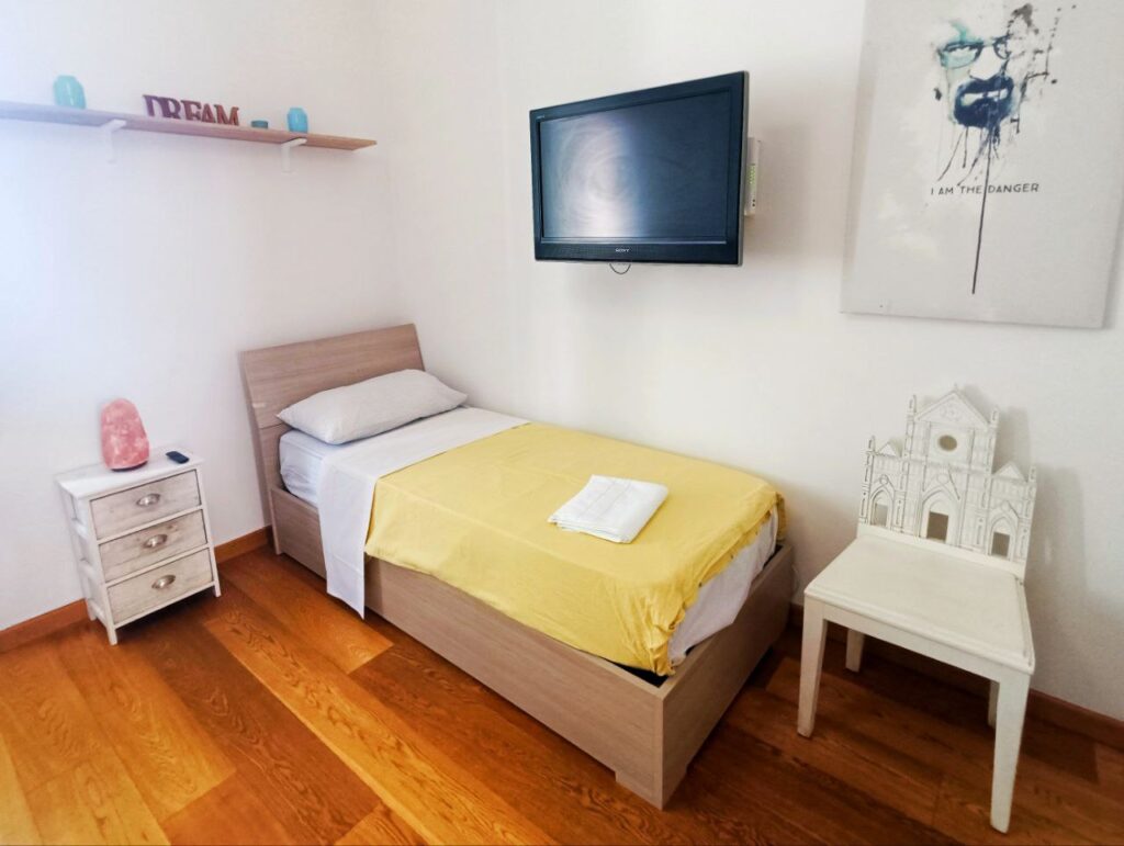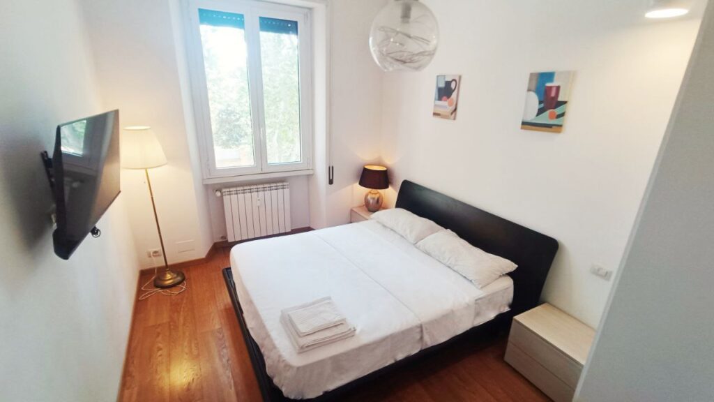 Camera spaziosa con letto matrimoniale, comodini, armadio capiente e TV. Dotata di aria condizionata in camera. Affaccio su Viale Giulio Cesare, finestre con doppi vetri per isolamento acustico. Ambiente confortevole, climatizzato e silenzioso per il riposo.